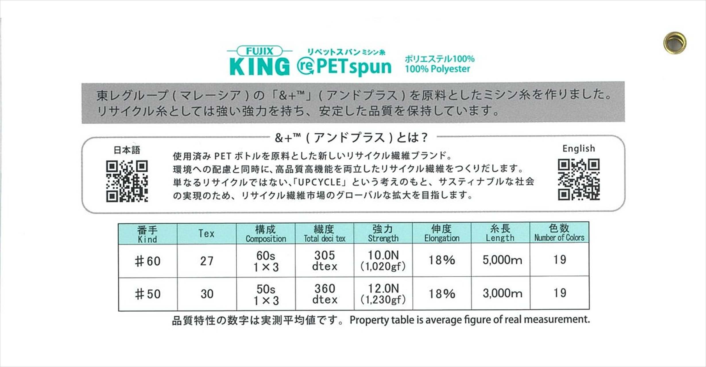 <ペットボトルリサイクル糸>環境問題に対して少しでも世界に貢献できるようにと考え、ペットボトルをリサイクルして作った地球に優しいポリエステルミシン糸です。リサイクル糸としては強い強力を持ち、安定した品質を保持しています。掲載品以外のフジックス・パールヨット・グンゼの糸をお求めの際はご連絡下さい。