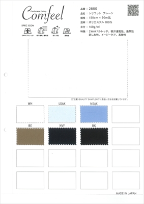 布帛見えするトリコットニット生地です。防シワ、吸水速乾、ストレッチ等様々な機能があり、幅広いジャンルに使用できます。